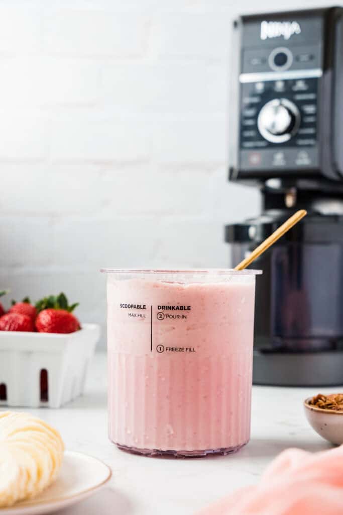 I love making smoothie bowls in the Ninja Creami because it is so easy to get a super thick smoothie bowl! If you have some extra strawberries lying around, this is the perfect way to use them up! This is also a great way to use up those less-than-perfect strawberries that your kids might not want to eat.
